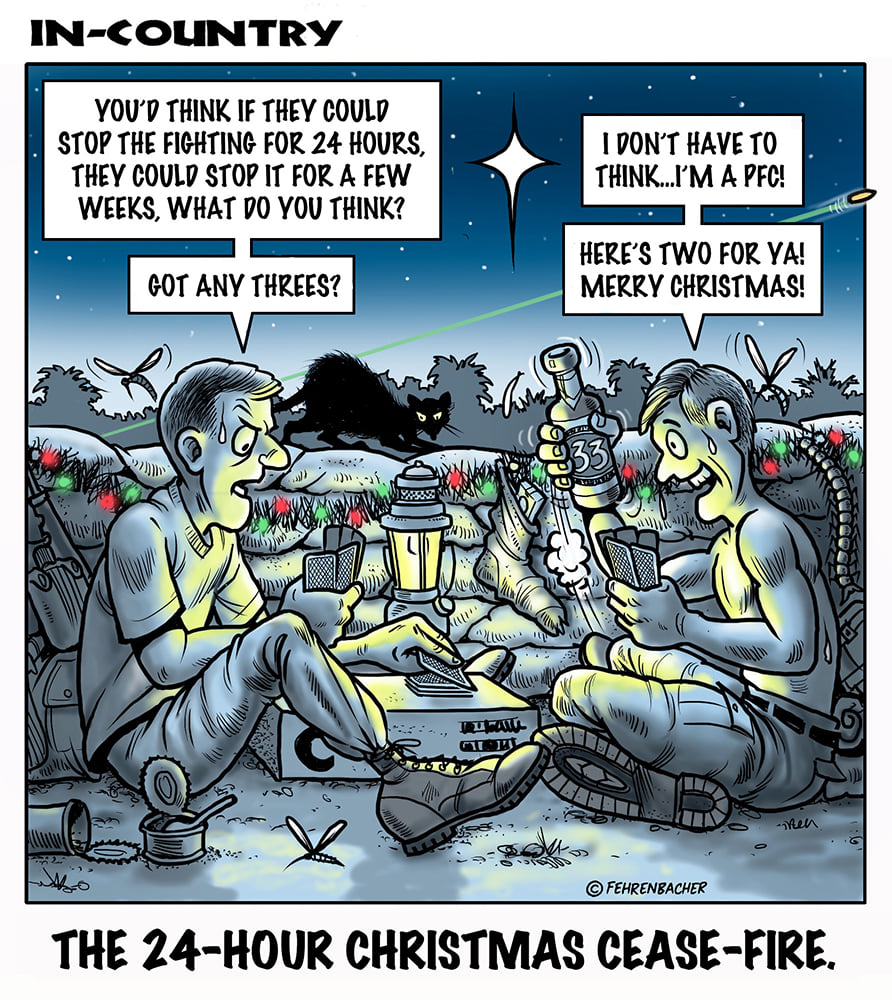 Phil enlisted in the Army in 1965 where you served for years in Vietnam. He became a graphic designer and has worked for the state of Oregon for 26 years. He retired in 2003 and started the Cartoon "In-Country". The cartoons reflect his experiences during his tour of duty in South Vietnam.